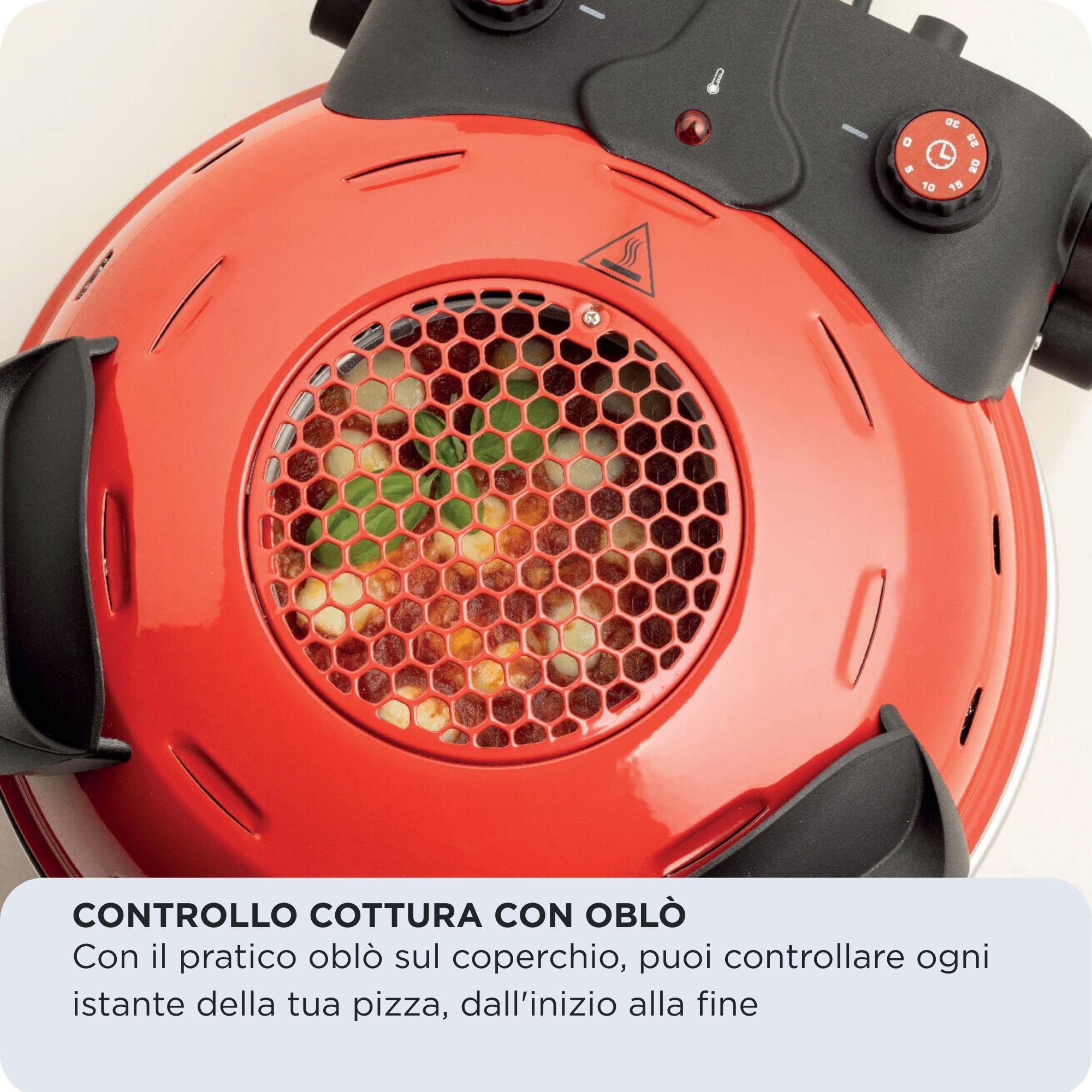 Dimentica il vecchio metodo del "apri e chiudi" che fa disperdere il calore e rovina la cottura. Con il pratico oblò sul coperchio, puoi controllare ogni istante della tua pizza, dall'inizio alla fine