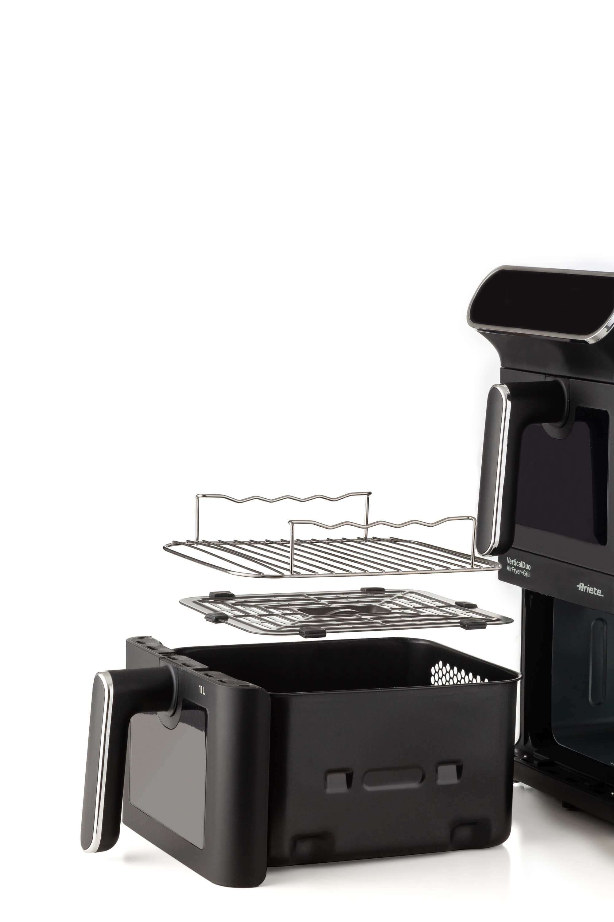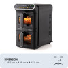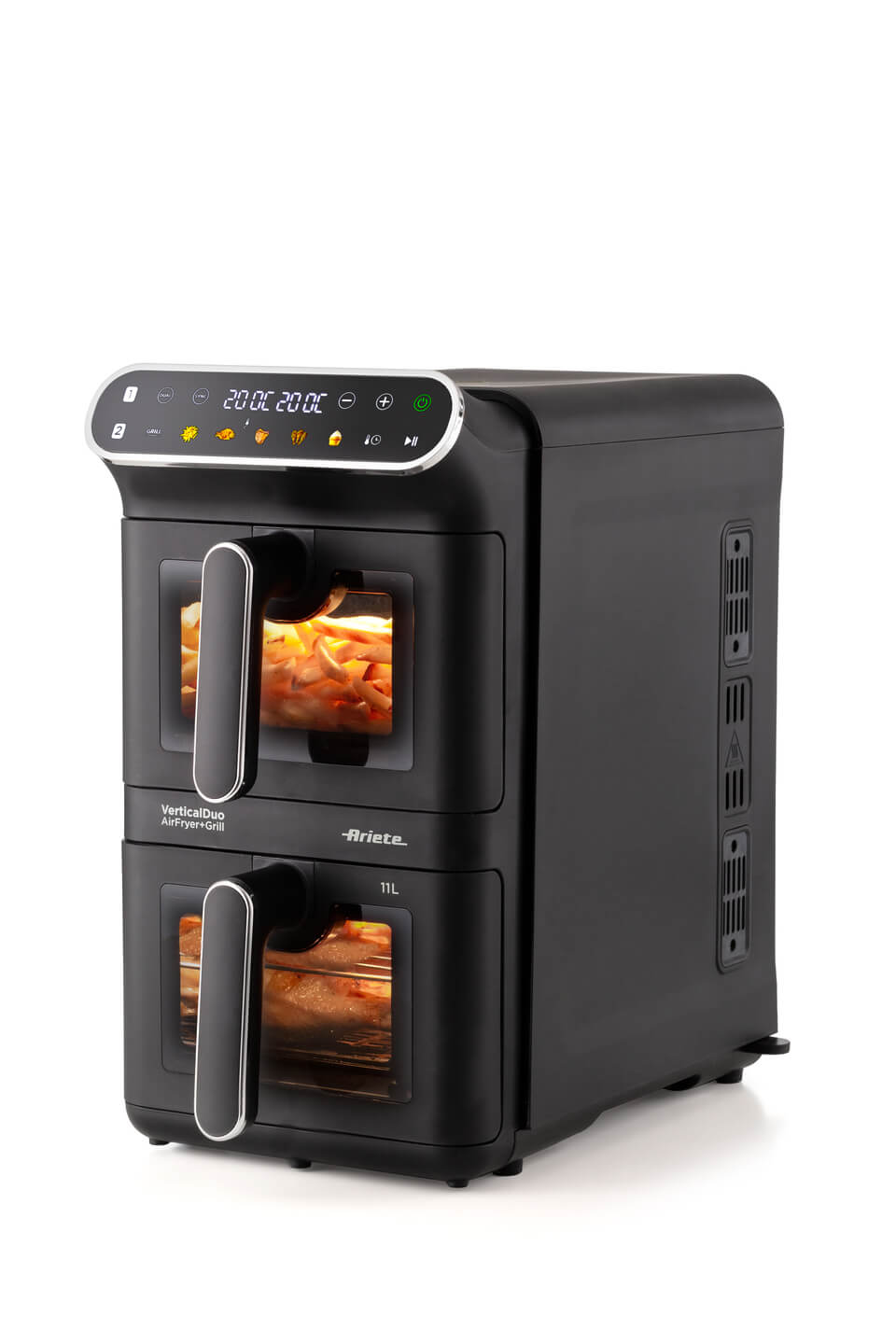 Friggitrice ad aria con doppio cestello verticale. 2 cestelli: 2x5,5L (11 litri). Cuoce 4 pietanze diverse contemporaneamente. Tecnologia Sync GRILL e DUAL. Finestre per controllo cottura.