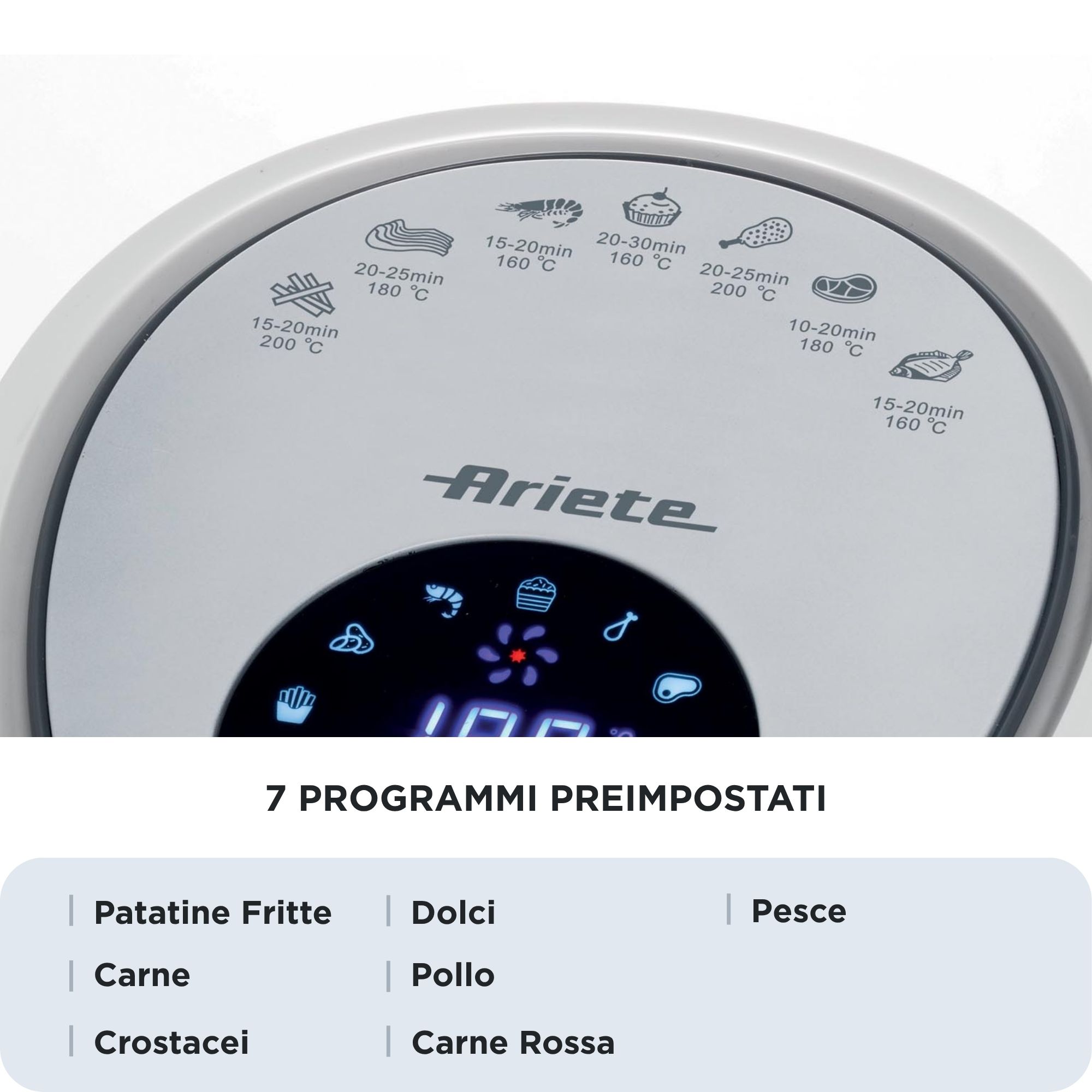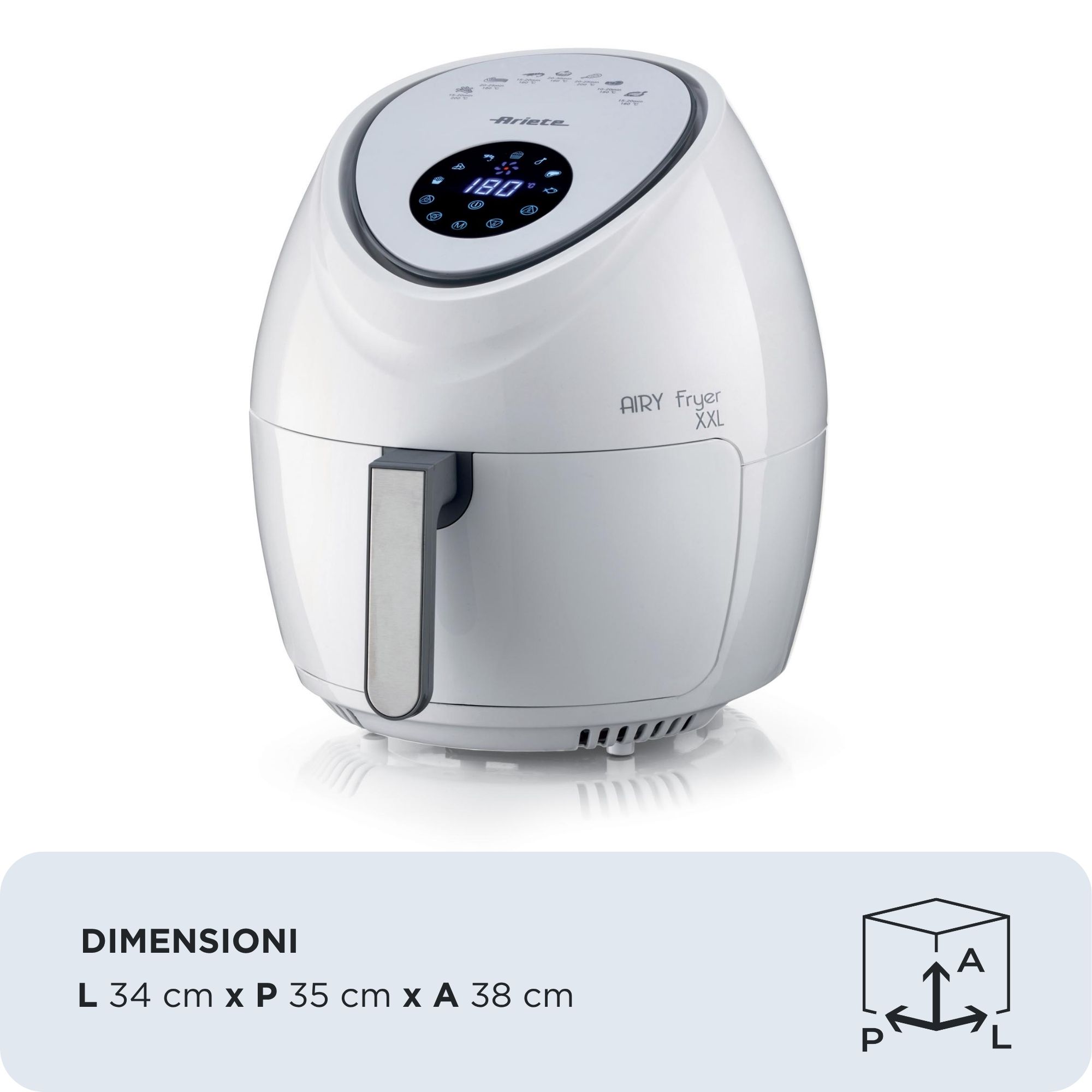 Con la friggitrice ad aria grande Airy Fryer XXL di Ariete puoi friggere qualsiasi pietanza, anche in grande quantità, utilizzando un solo cucchiaio di olio per ottenere fritture sane e gustose allo stesso tempo. Grazie al cestello XXL da 7 litri con Airy Fryer XXL di Ariete potrai cuocere fino a 2,5 kg di patatine fritte in una sola volta! Patatine fritte, ma non solo, anche crocchette, pesce, carne e tanti altri alimenti impanati, sia surgelati e pronti da friggere, che freschi e appena impanati, grazie alle 7 modalità di cottura preimpostata.