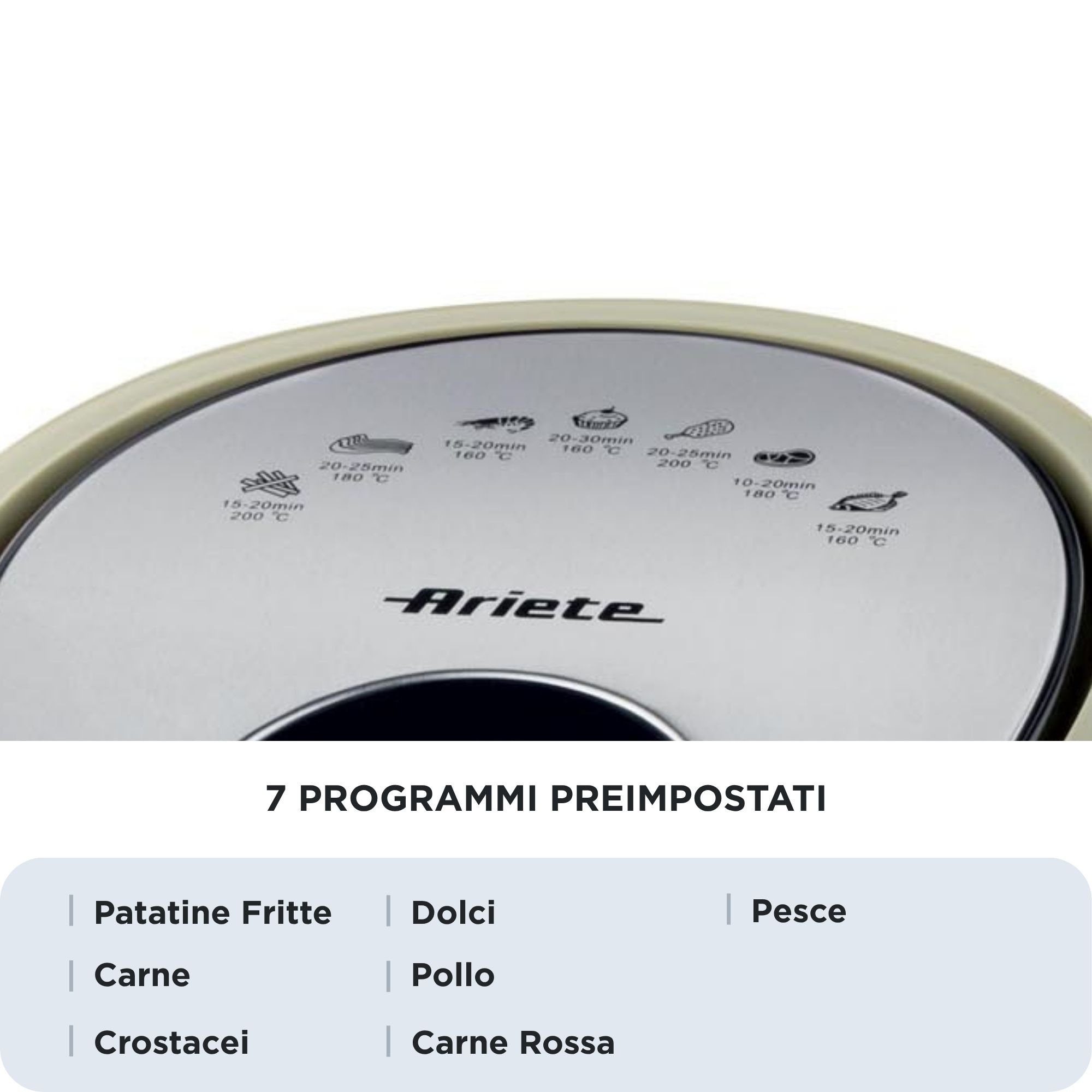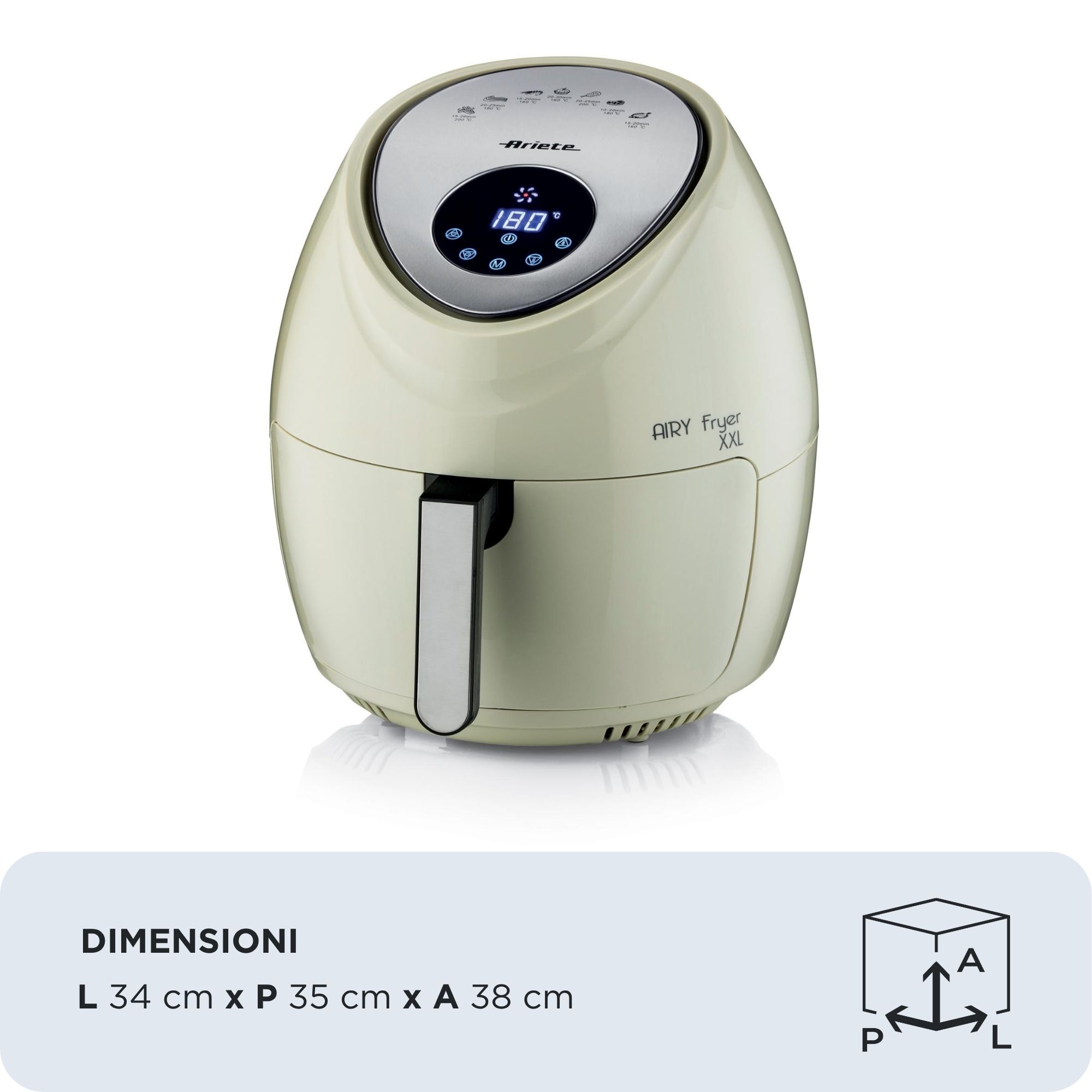 Con la friggitrice ad aria grande Airy Fryer XXL di Ariete puoi friggere qualsiasi pietanza, anche in grande quantità, utilizzando un solo cucchiaio di olio per ottenere fritture sane e gustose allo stesso tempo. Grazie al cestello XXL da 7 litri con Airy Fryer XXL di Ariete potrai cuocere fino a 2,5 kg di patatine fritte in una sola volta! Patatine fritte, ma non solo, anche crocchette, pesce, carne e tanti altri alimenti impanati, sia surgelati e pronti da friggere, che freschi e appena impanati, grazie alle 7 modalità di cottura preimpostata.