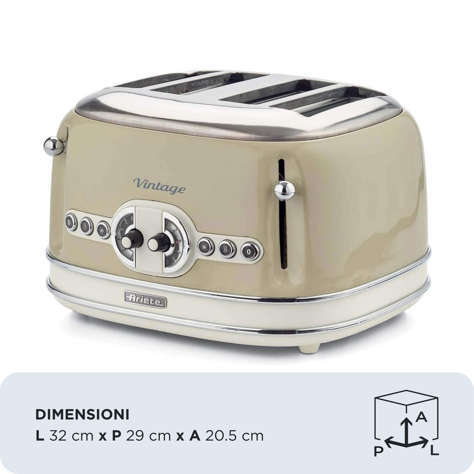 Il tostapane Vintage di Ariete ha 4 slot per tostare contemporaneamente quattro fette di pane per le tue colazioni e merende extralarge! Grazie al vassoio raccoglibriciole estraibile puoi eliminare facilmente e in sicurezza eventuali residui rimasti all’interno del tostapane durante la tostatura.