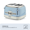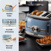 4 slot con comandi separati 2x2. 6 livelli di doratura. Espulsione automatica delle fette. Corpo in metallo e pareti fredde. Tosta, riscalda e scongela. Senza pinze. Celeste